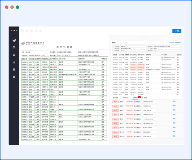 系统自动解析电子流水、执行数据审核,支持国内几千家银行流水识别,支持与打印纸质流水交叉比对